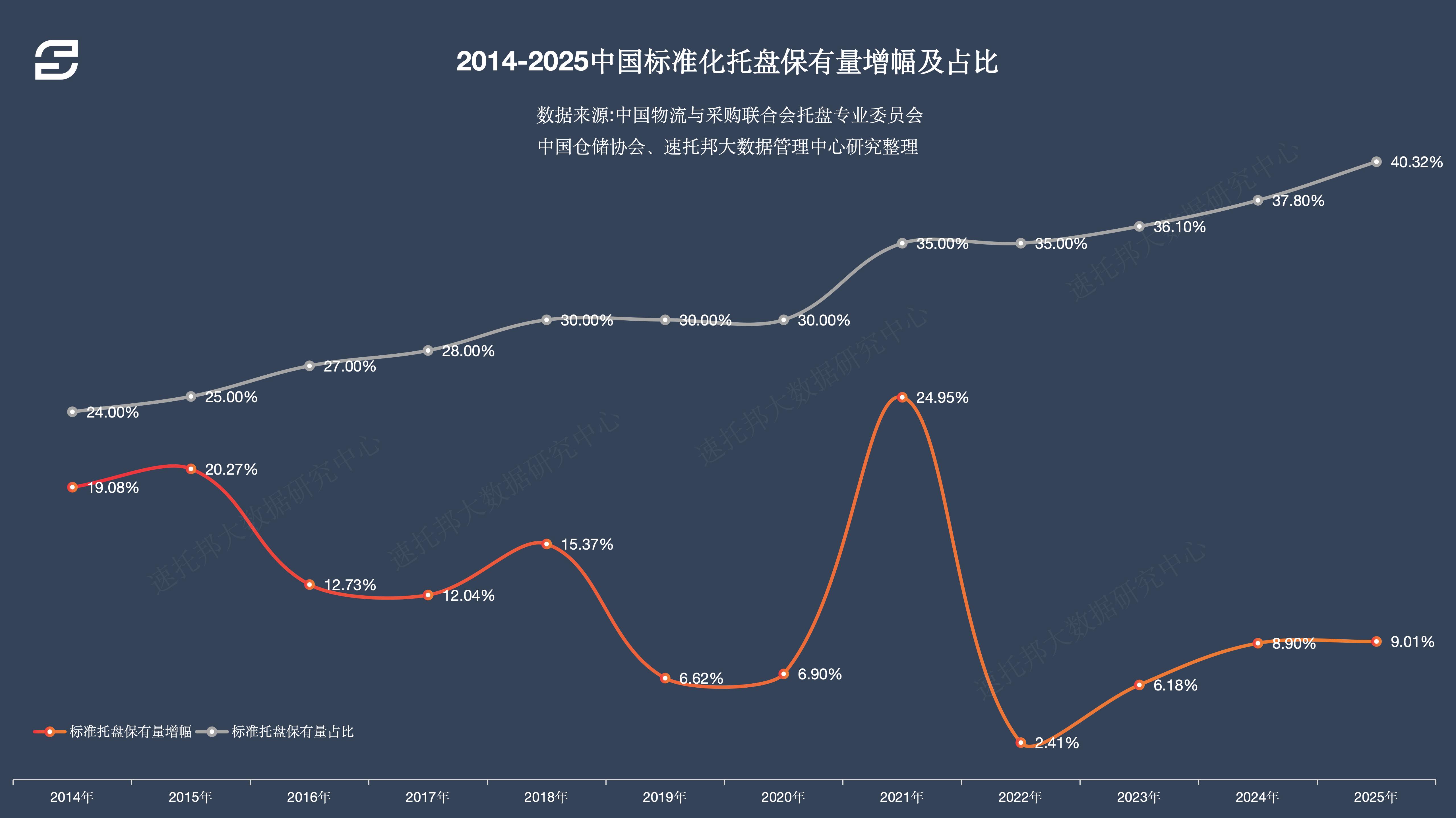 速托邦大数据:2014-2025中国标准化托盘保有量增幅及占比