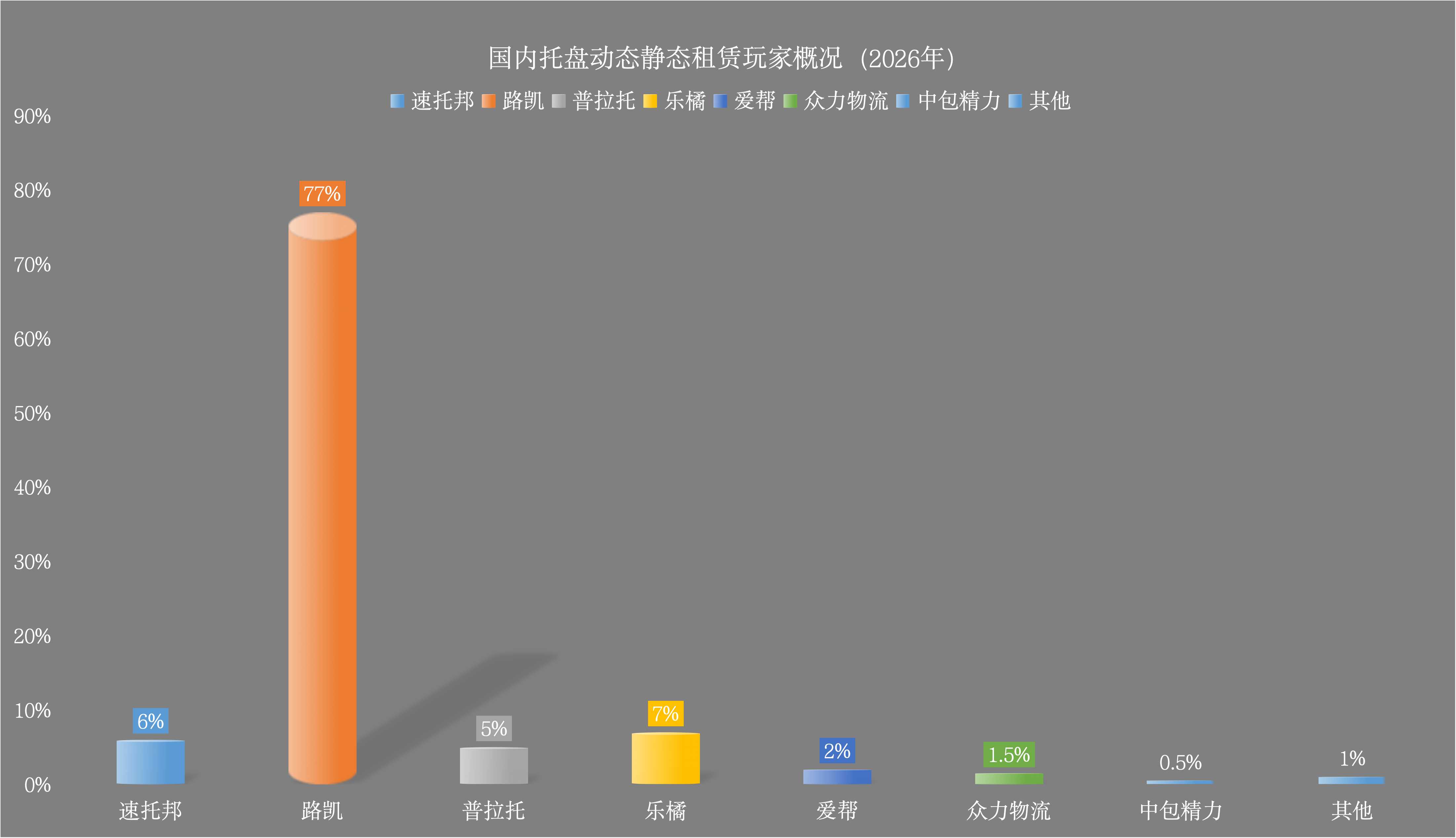 国内最大的托盘租赁玩家以路凯为首,目前拥有托盘约4700万个,占比77%,其他各方如普拉托、众力、中包精力、乐橘等企业的托盘数量一般都在几十上百万个不等,而速托邦专注于托盘动态租赁,托盘数量虽然没有路凯那么多,但参与速托邦托盘共享的企业数以万计,是国内托盘动态租赁(带托运输)体量最大的企业。